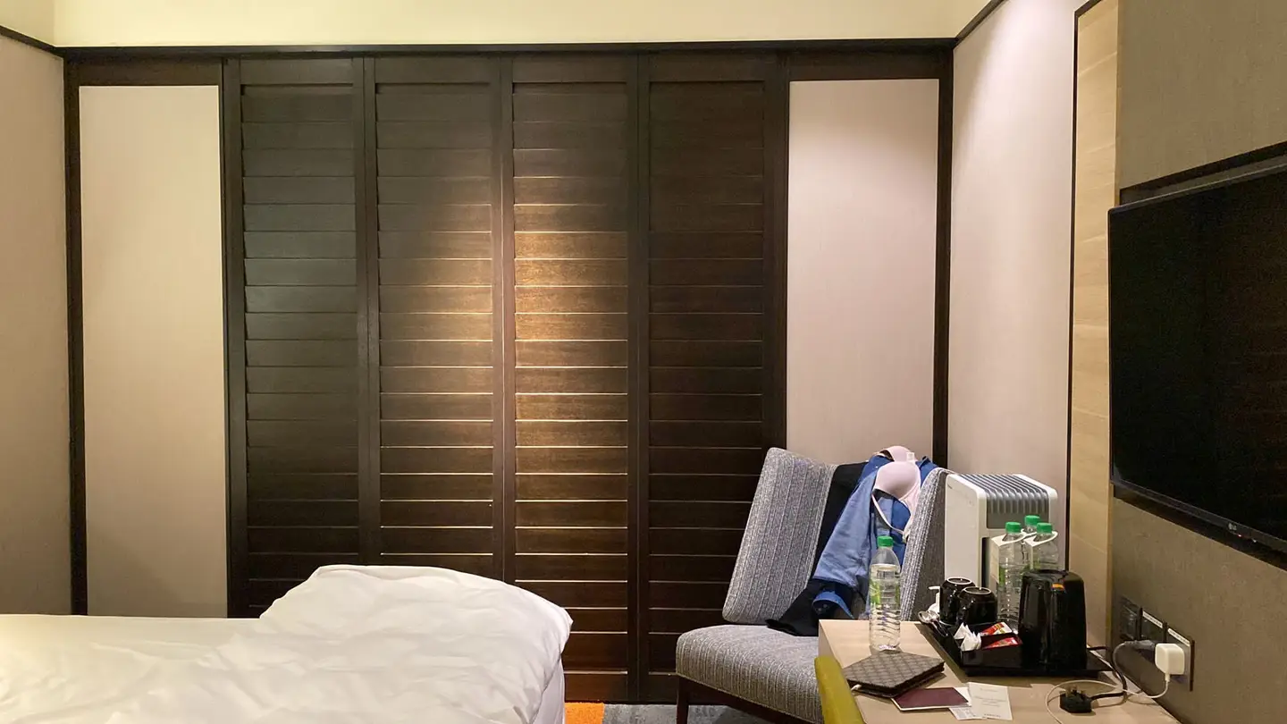 Se a janela castanha não fosse um painel pregado, este quarto do Aerotel, um hotel de trânsito no aeroporto de Singapura, seria semelhante a tantos outros quartos de hotel. Só que é um quarto interior porque a janela não abre